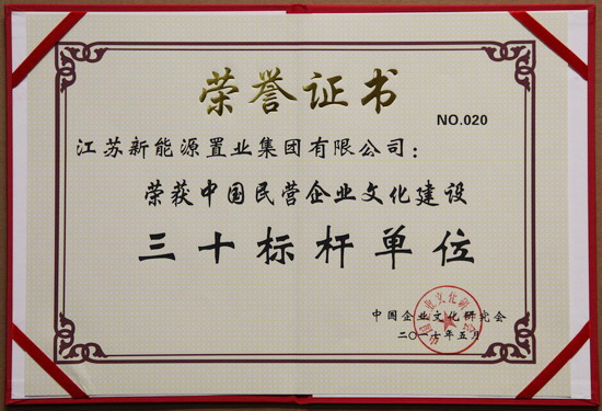 会上,中国企业文化研究会授予江苏新能源置业集团中国民营企业文化建设三十标杆单位;荣誉称号。