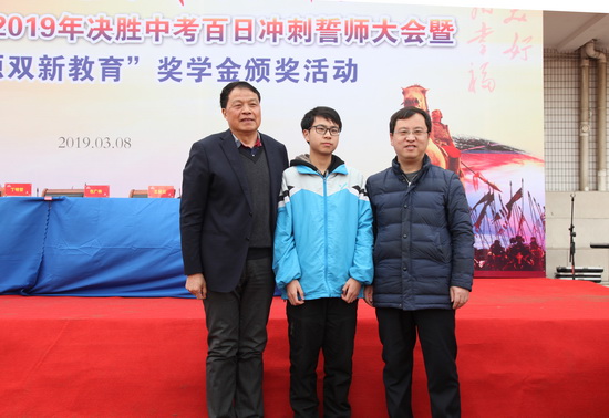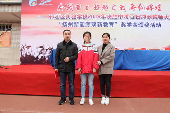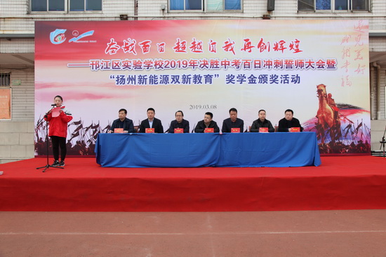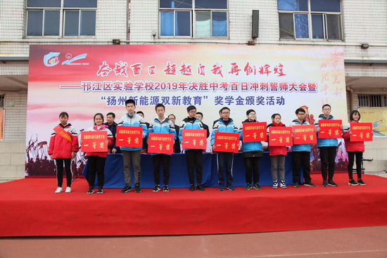 首先,邗江区实验学校九年级全体同学进行奋战百日、超越自我、再创辉煌;决胜中考宣誓。接着,活动现场举行聘请人生导师仪式,一批学生和家长向人生导师颁发聘书。在欢快热烈的气氛中,一批品学兼优的初三学生登台领取新能源双新教育奖学金;,有50名学生获得一等奖,每人奖金500元;有130名学生获得二等奖,每人奖金300元;有320名学生获得三等奖,每人奖金100元。本次共发奖学金96000元。