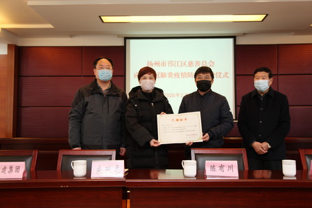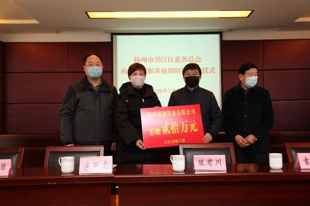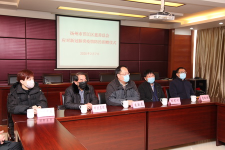 众志成城抗疫情,同舟共济渡难关。;2月7日上午,邗江区慈善总会的会议室洋溢着浓浓的暖流,来自邗江区的部分企业为抗击疫情的捐赠仪式在这里举行。